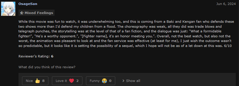 Diemžēl, lai arī kā man patiktu Kengan cīņas vairāk, cīnoties Baki > Ohma. :/