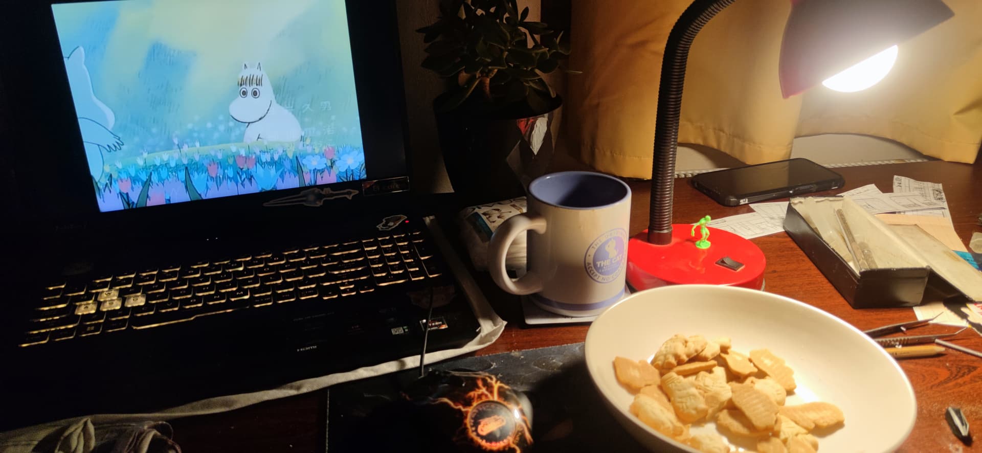No sākuma noskatījāmies Violent night, tik nežēlīgs gabals, bet patika, pēc tam kaut ko mierīgāku, mīļos Muminus ar tēju un cepumiem Muminiem