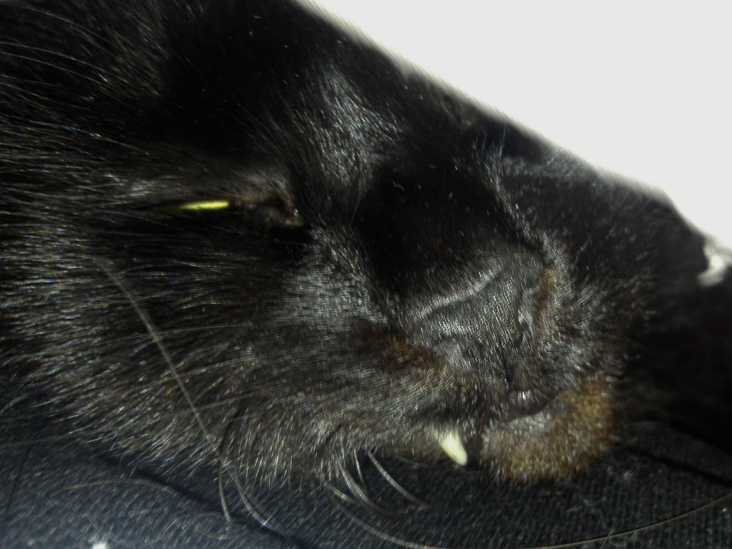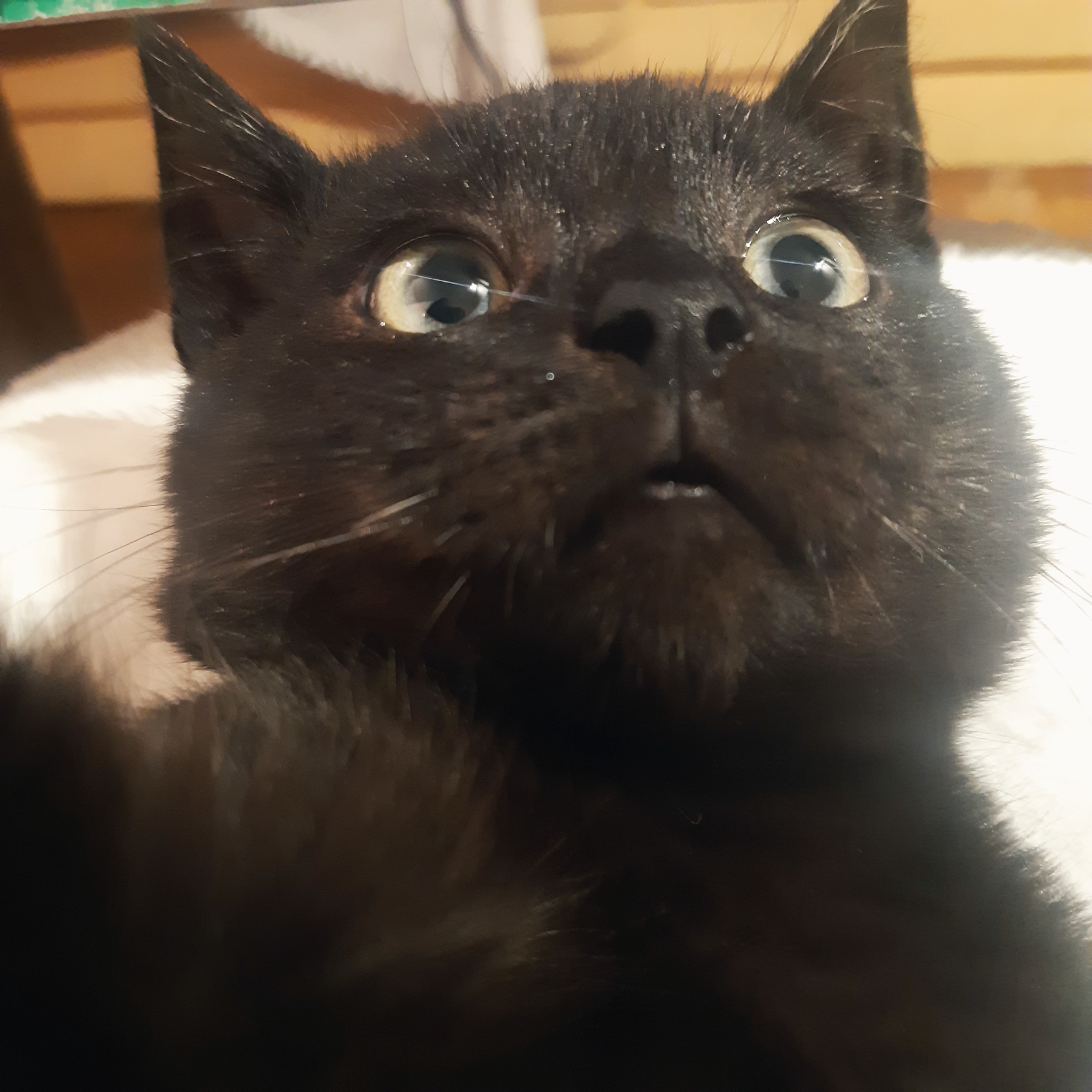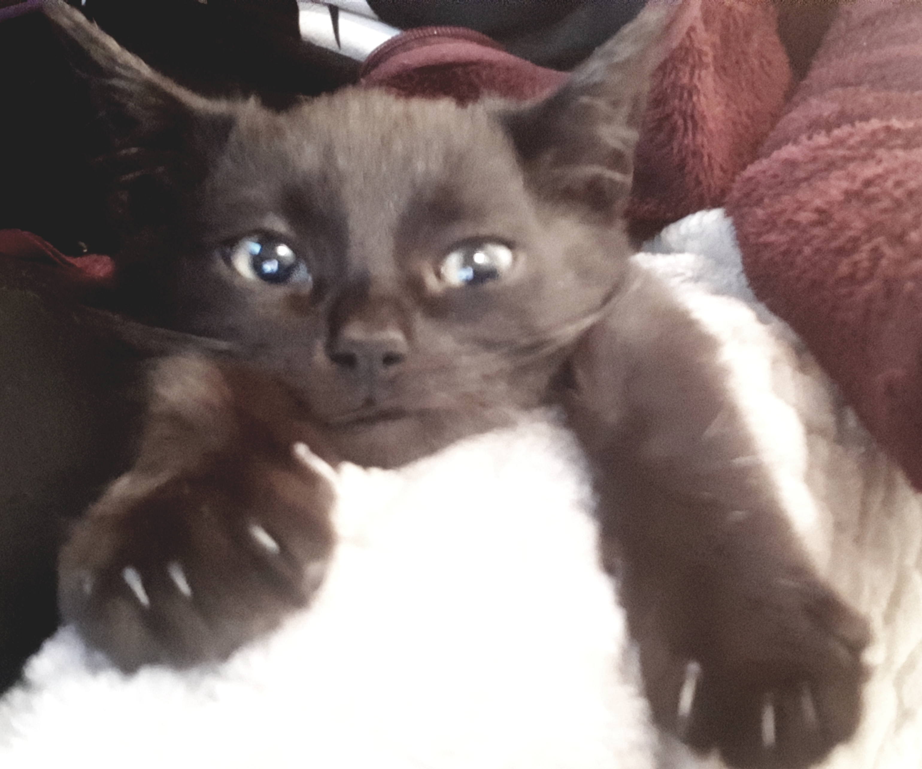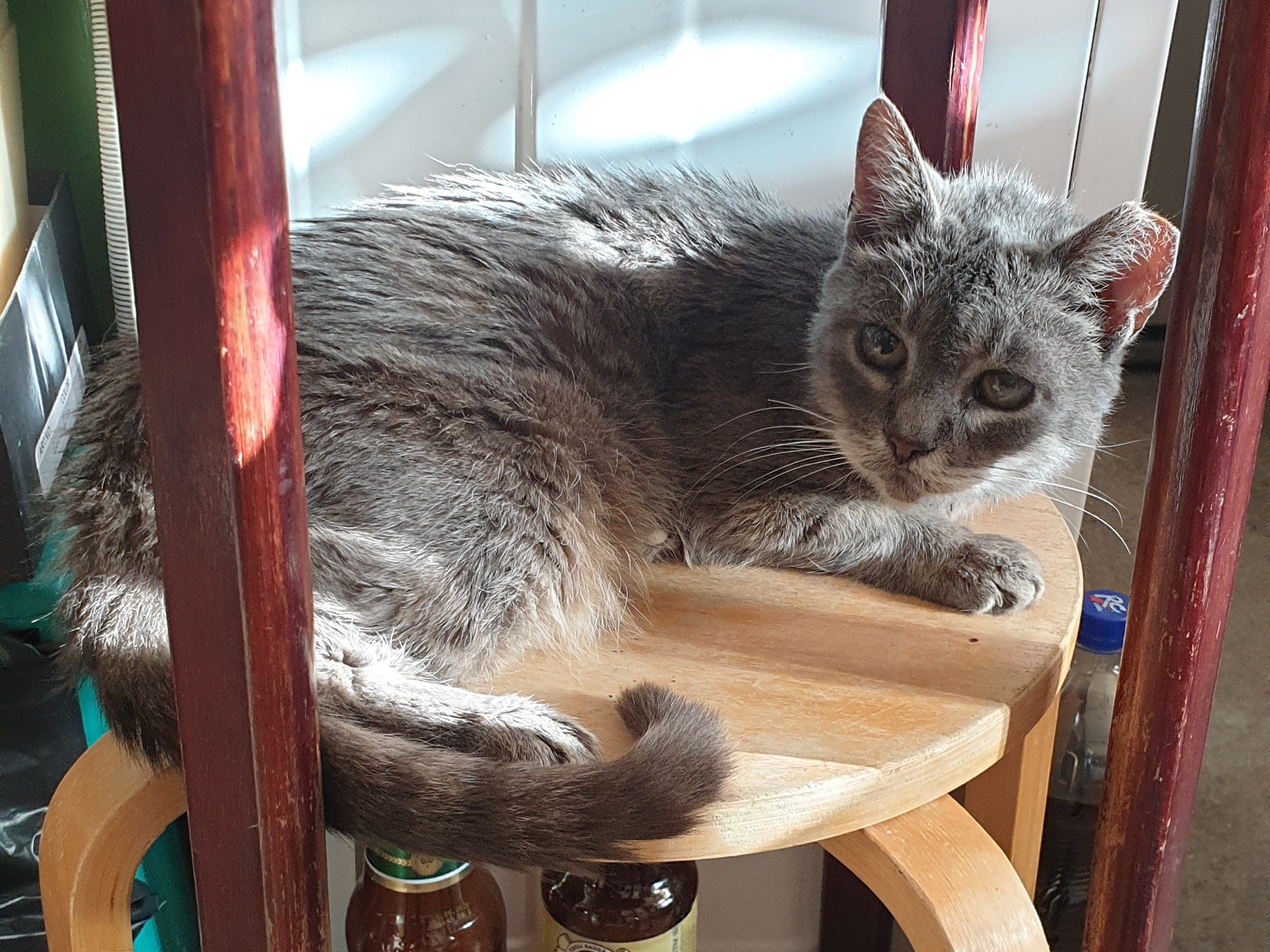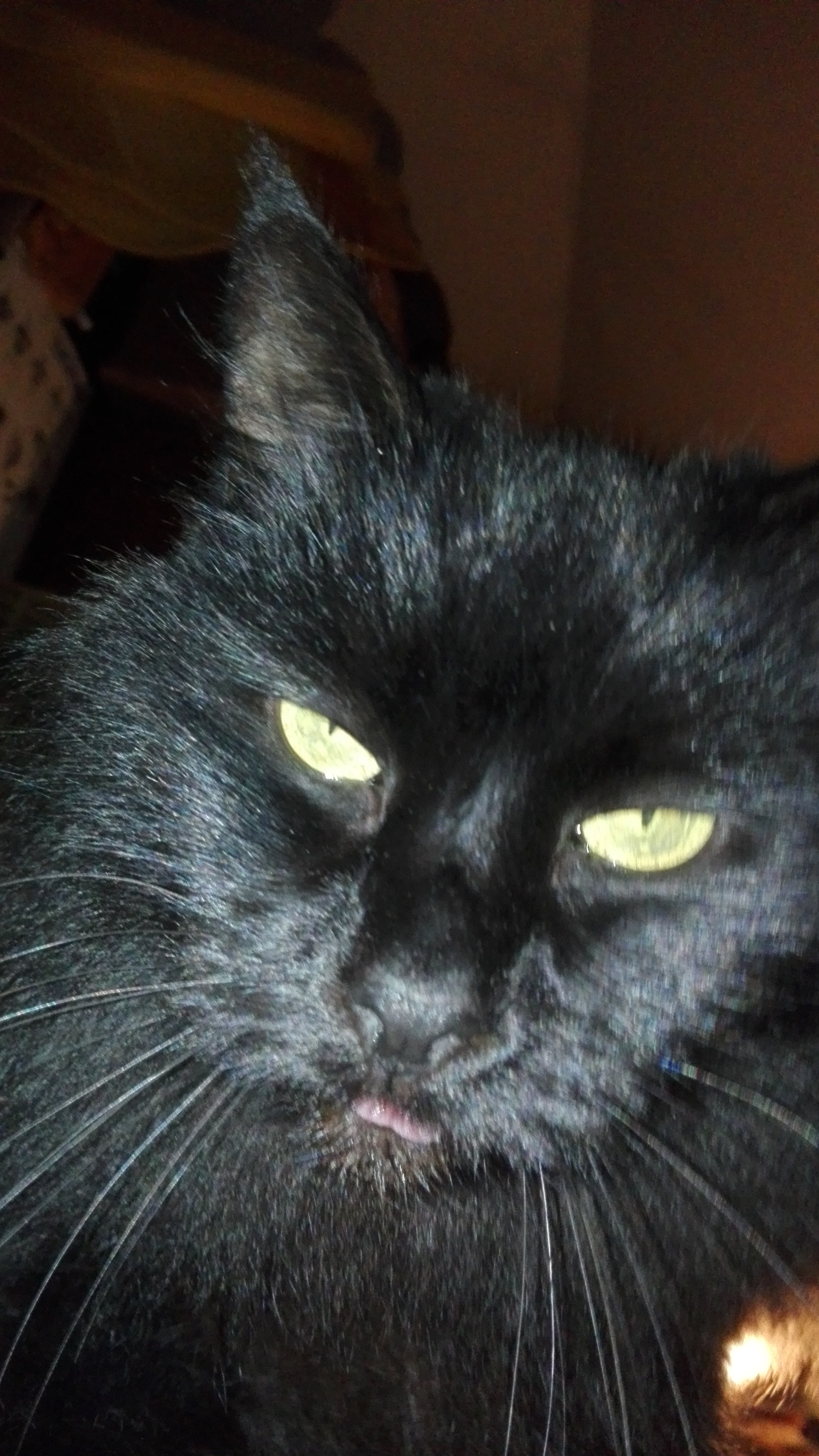 Mēs viņu paņēmām no ielas kad tā bija kaķēns. Viņai bija nopietna infekcija ap acīm tā ka bija uzpampumi, kas varēja viņu padarīt galīgi aklu. 100% nebūtu izdzīvojusi tajā laikā. Mums izdevās tās acis dezinficēt, bija ilgs un sāpīgs process, bet beigās atlaba. Acis gan bija pusaklas, bet vismaz kaķene nodzīvoja nosacīti pilnvērtīgu dzīvi. Joprojām nevaru pierast, ka vairs nav viņas.