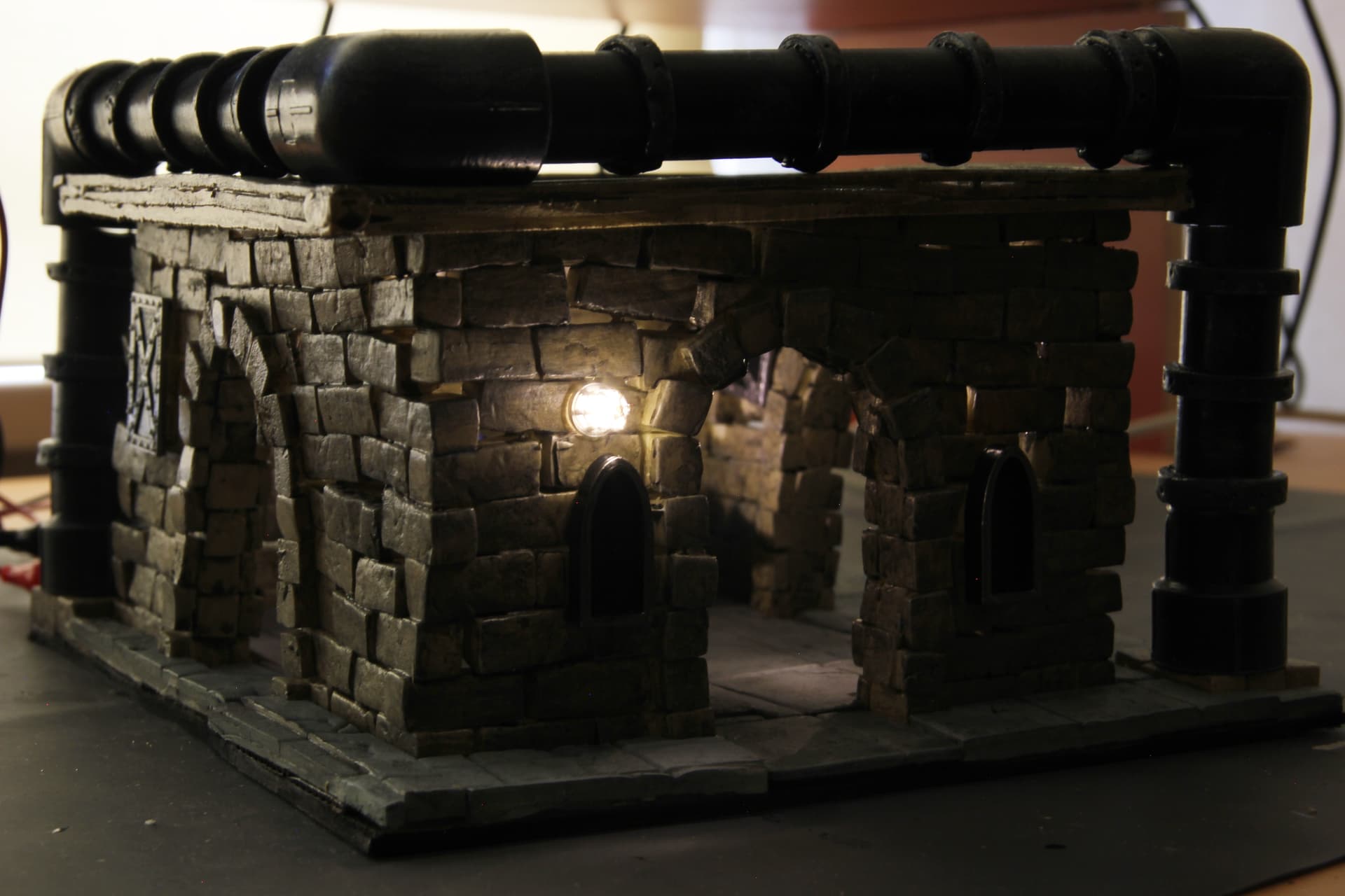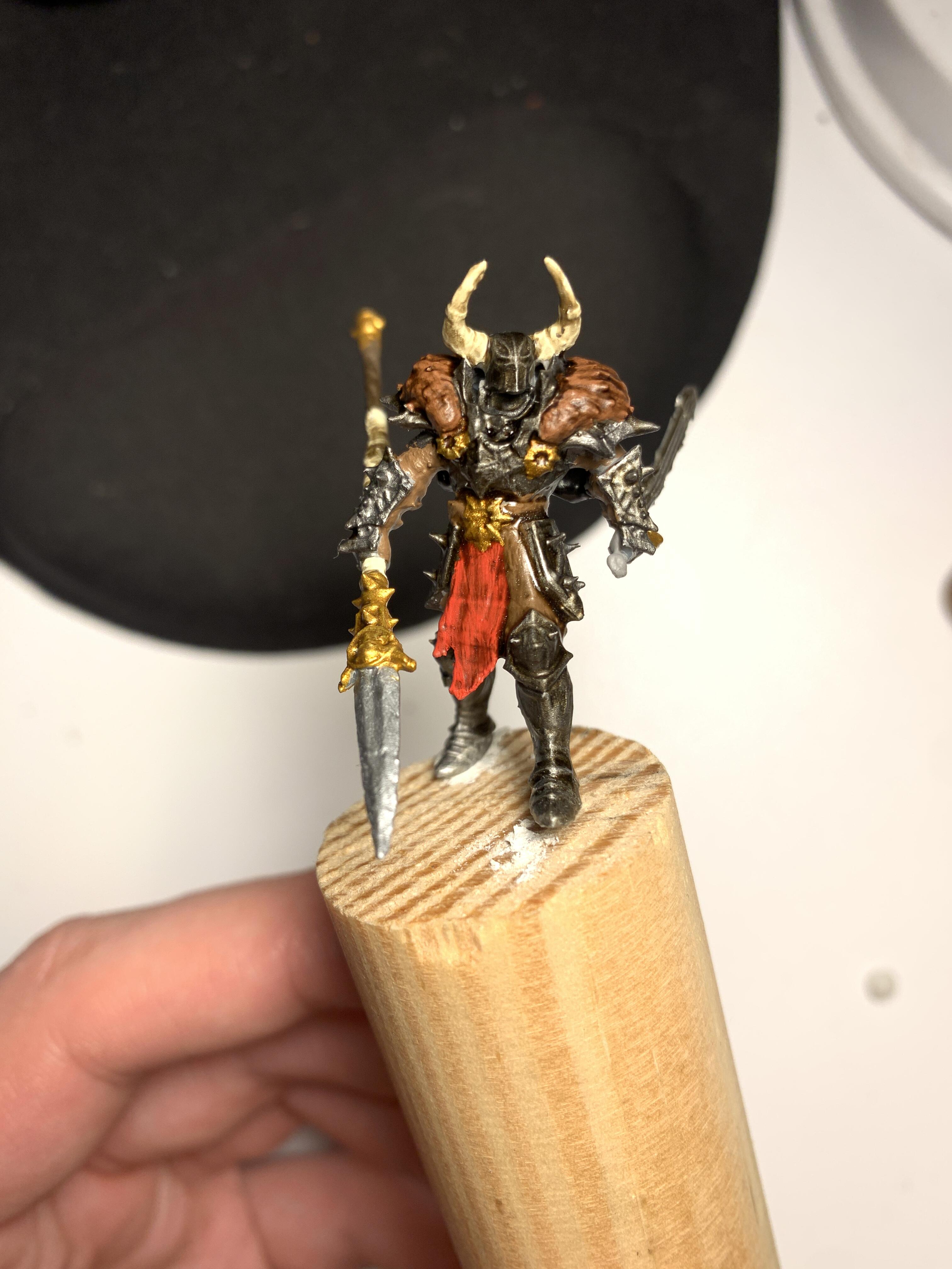 Nu tā poza kliedz pē ieroča, ieteiktu vienā no rokām tādu pamatīgu veseri iedot. Šādā mērogā, pat velns nezinu no kā varētu uztaisīt ko tādu, nelielām pildspalvu detaļām vienīgi