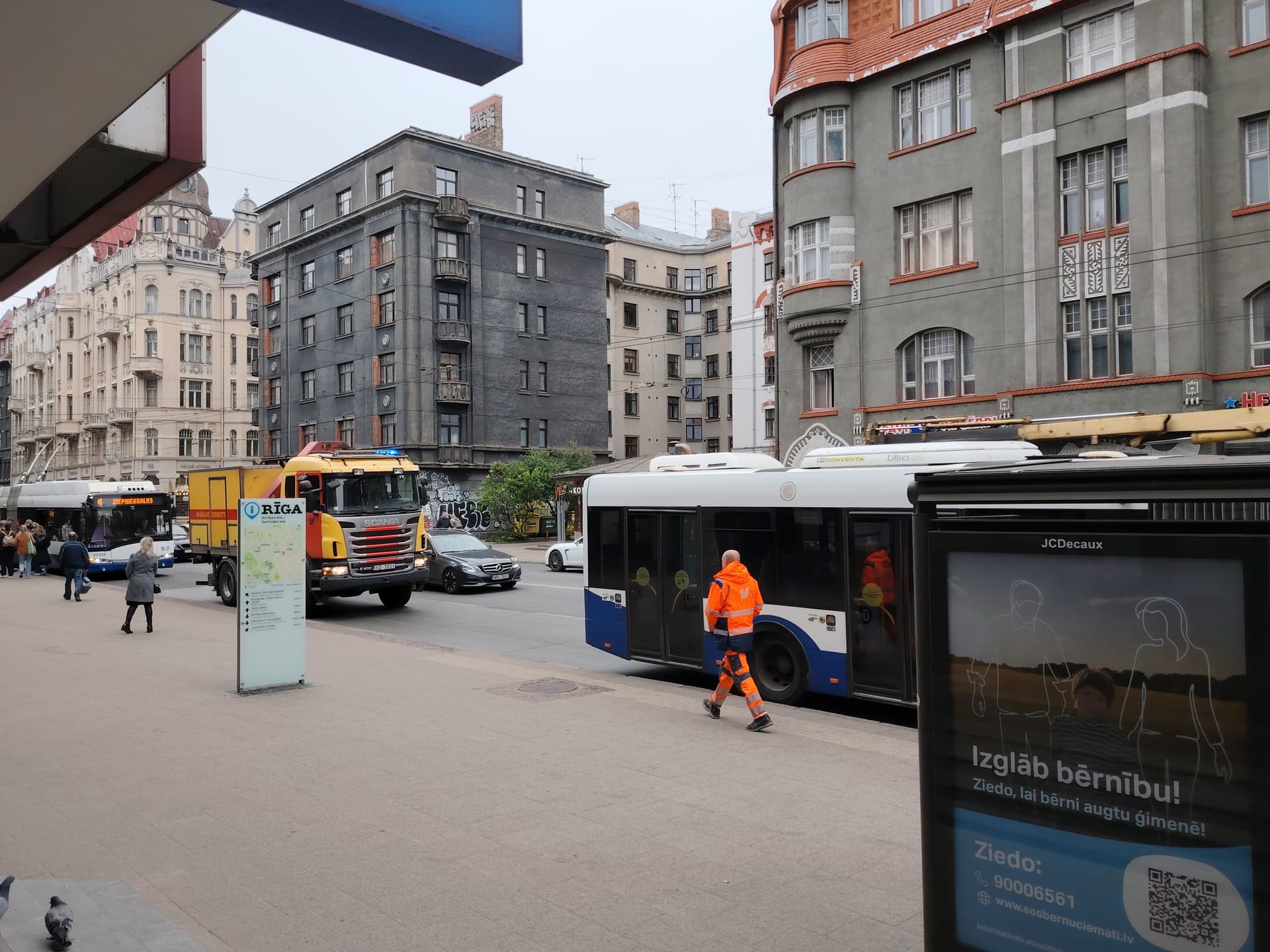 Pie Ģertrūdes ielas pieturas buss noplīsis. Iespējāms hidraulika, jo gar trotuāru līdz krustojumam tāds savāds, viegli sarkanīgi šķidrums bij. Pats buss pilns ar vīriem oranžos kombinezonos un skābā sejām