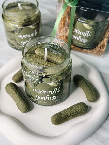 Kad te nesen biju Liepkalnos, tur blakus veikaliņā “Latvis dara” tieši gurķu burkas sveces iekrita acīs. tur gan bija šis ražotājs