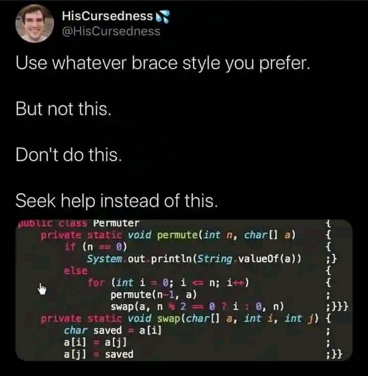 Tas izskatās pēc trakā ģēnija, vismaz būtu super viegli saskatīt sintakses kļūdas vismaz norādījumu beigām, kur viegli iespiest nepareizo simbolu